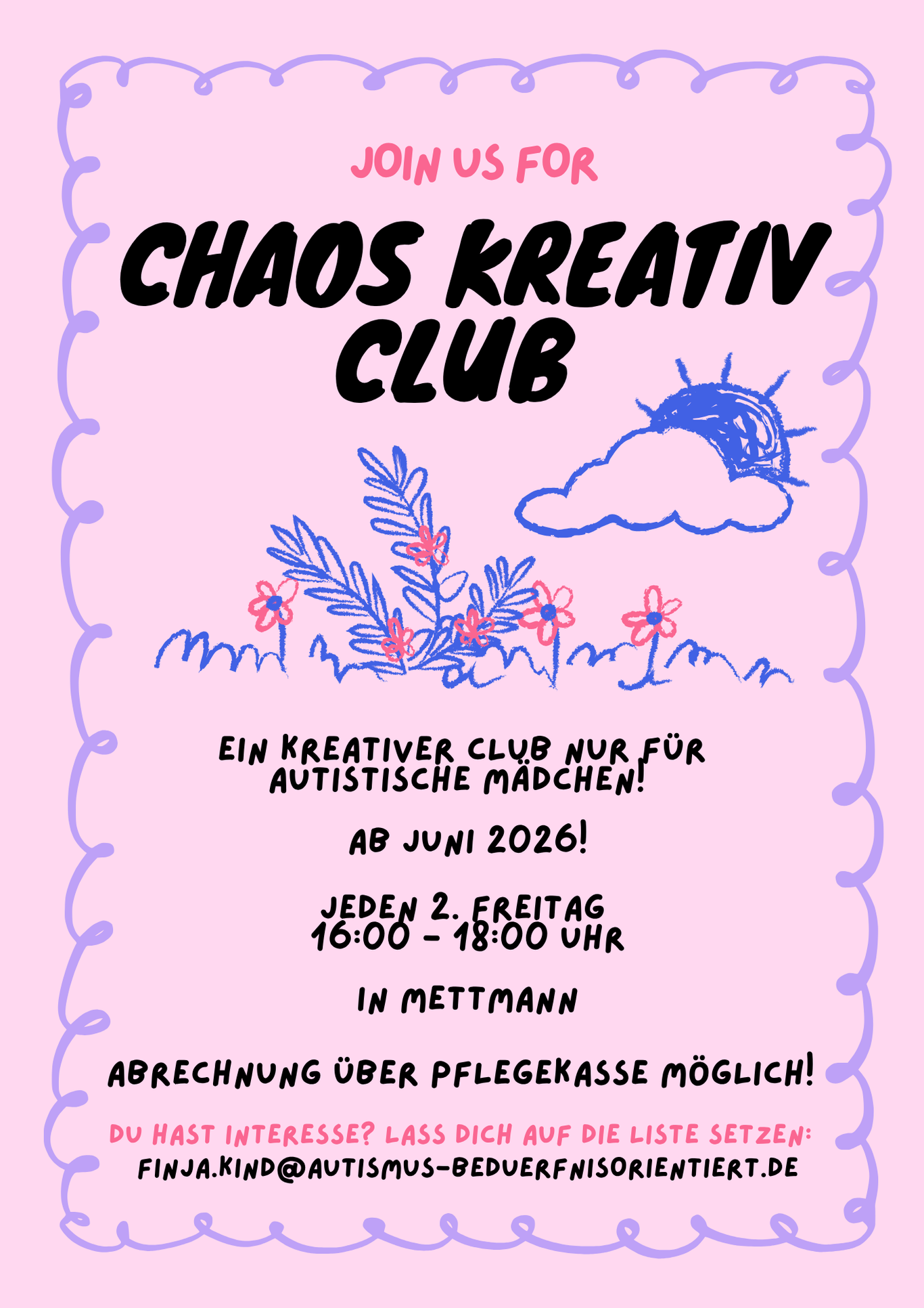 Der Chaos-Kreativ-Club startet in Mettmann !Jeden zweiten Freitag von 16-18 Uhr können sich Mädels im Autismus-Spektrum ohne Eltern oder Bezugspersonen kreativ ausleben, sich austauschen und Kontakte knüpfen.